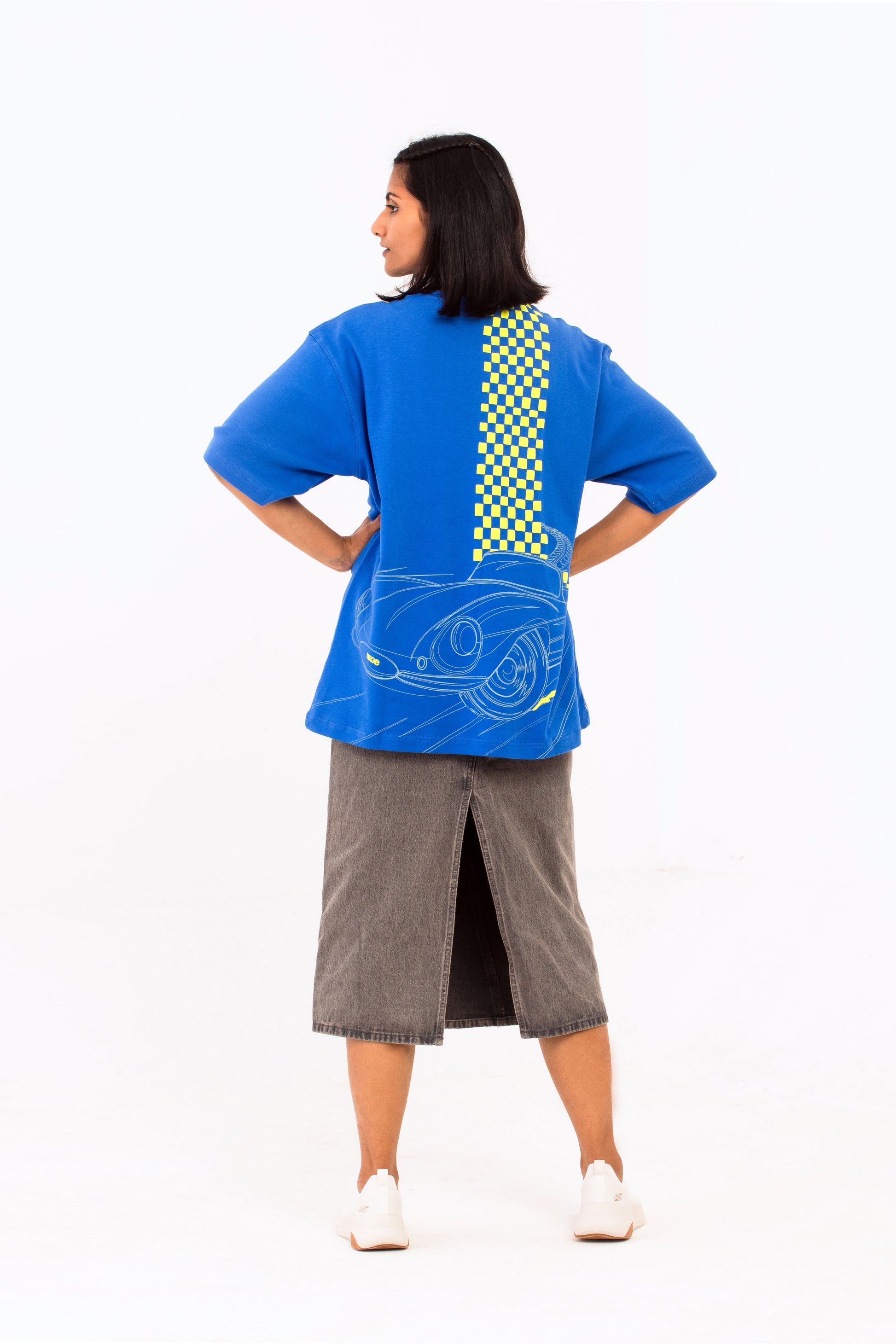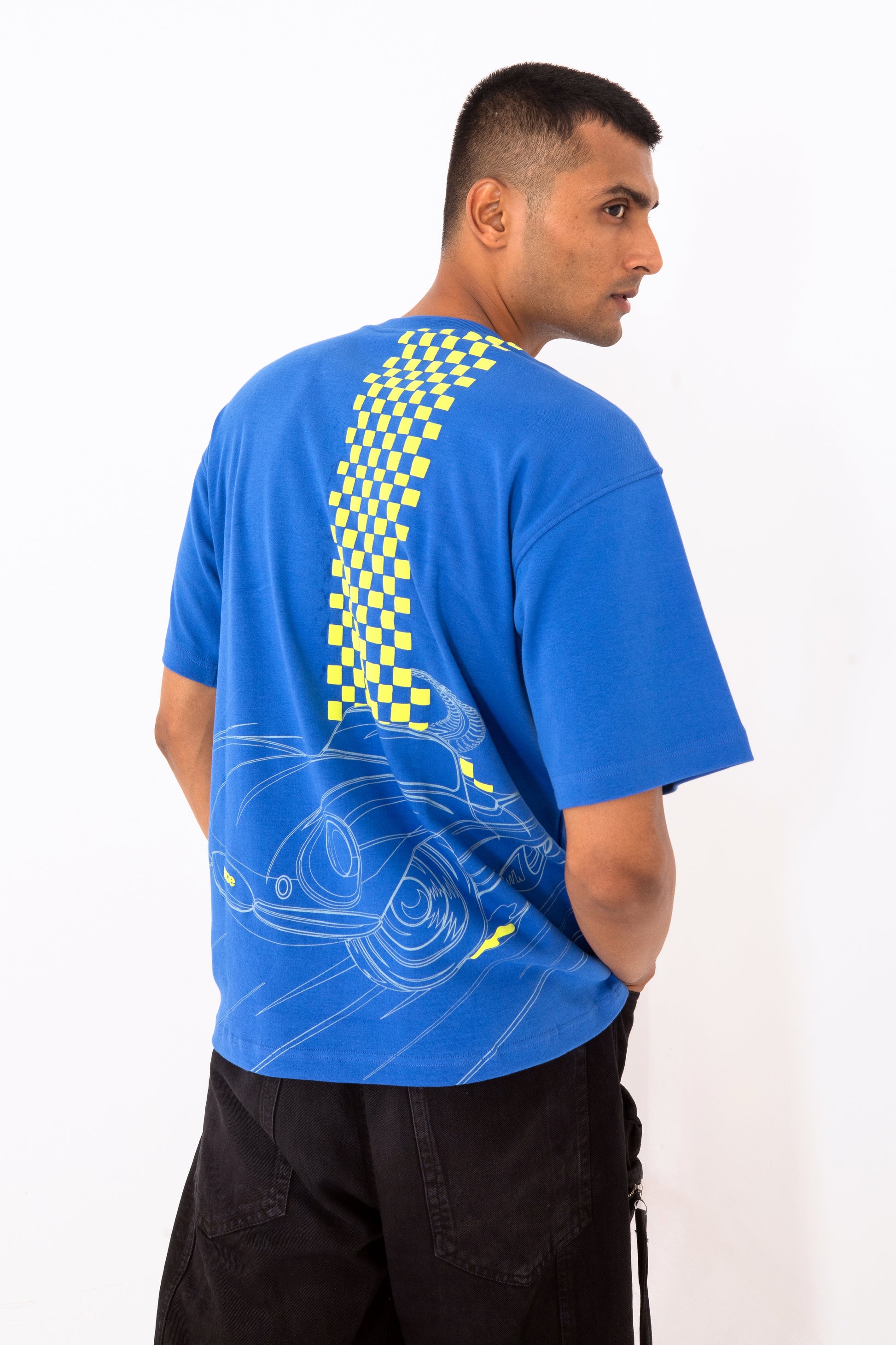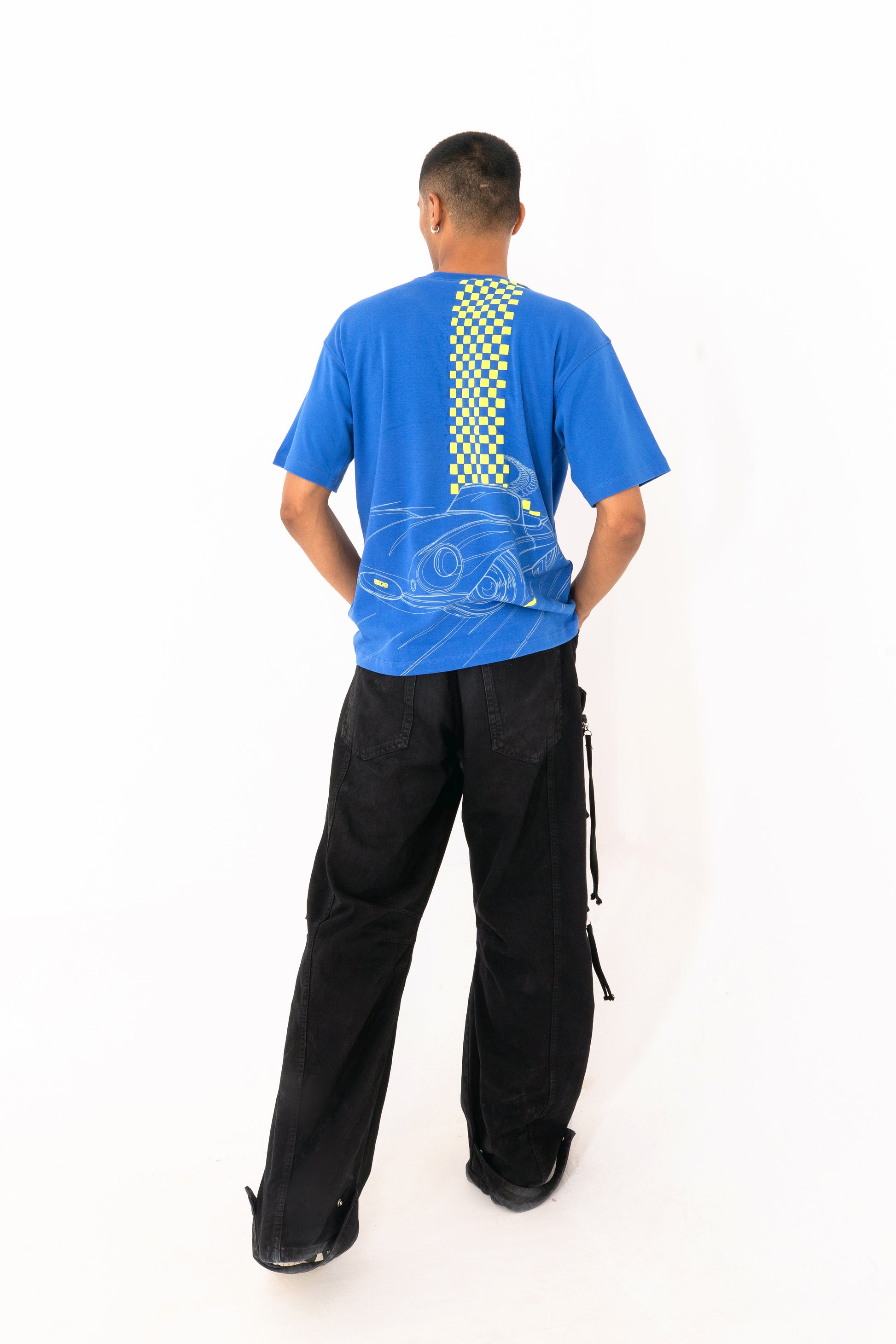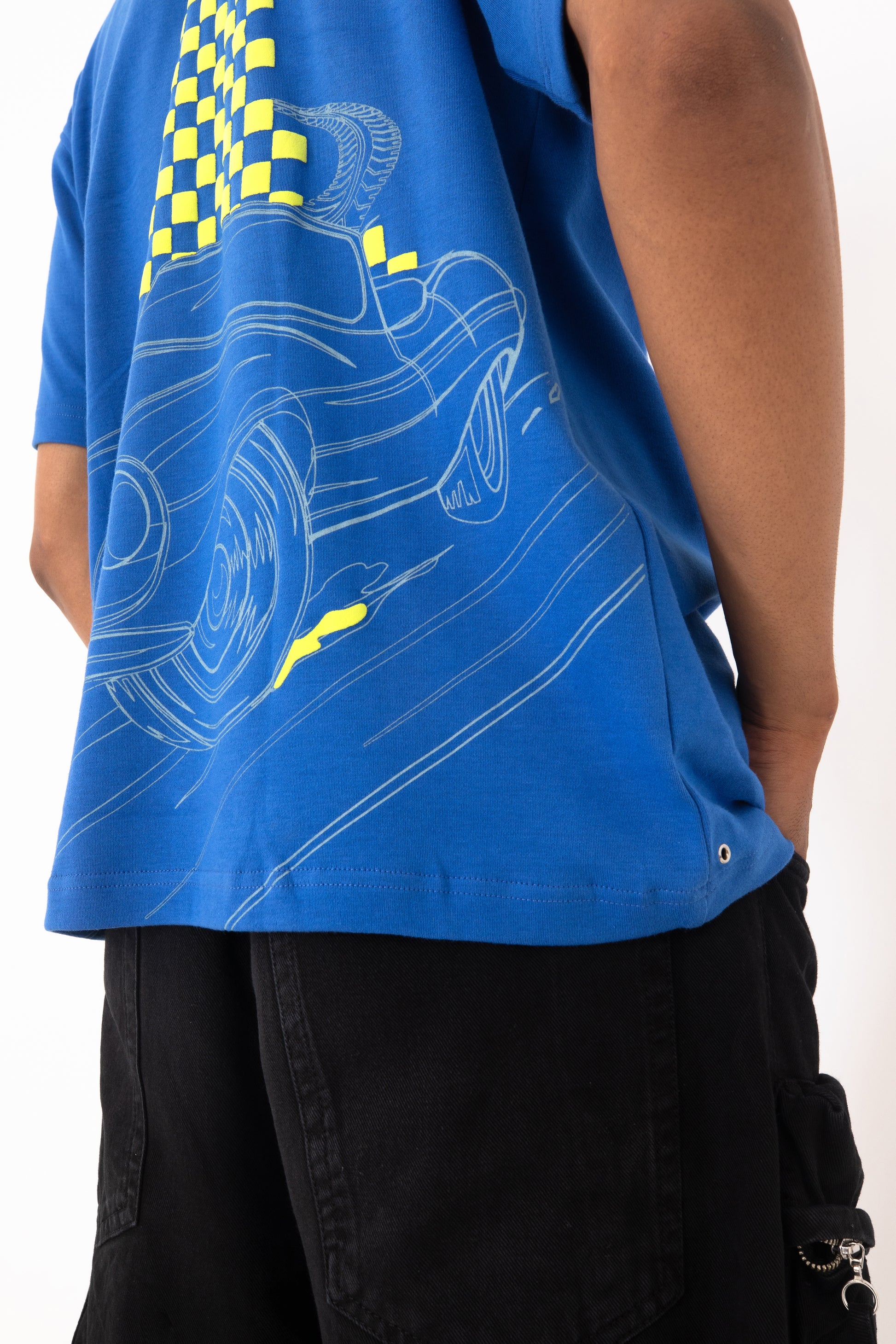 Crafted from heavyweight cotton in a vivid electric blue, this tee brings velocity to life. The back graphic, an outlined sports car streaking beneath a sharp yellow checkerboard. Captures the rush of movement and the thrill of looking ahead. The punch of colour is bold yet wearable, and the relaxed cut makes it a piece that dresses you up without demanding the effort.